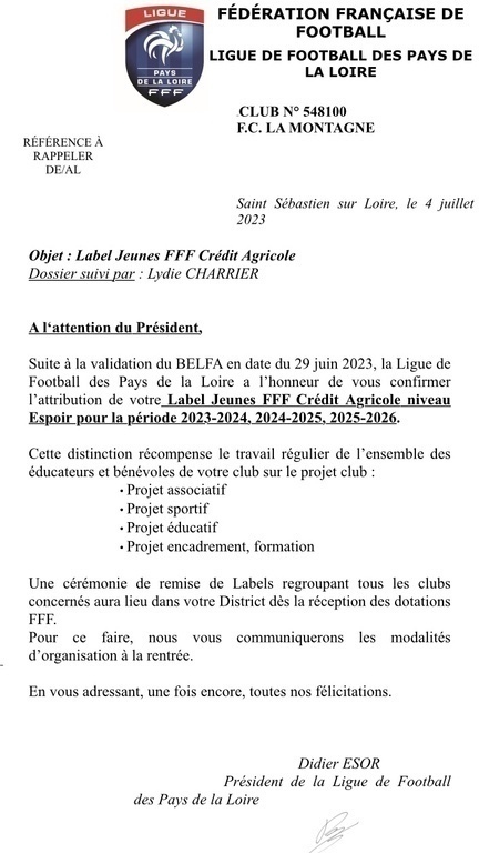 Le mardi 4 Juillet 2023 le FCLM s'est vu félicité par la Ligue de Football des Pays de la Loire. En effet, notre club à reçu l'attribution d'un nouveau Label Jeunes FFF.⚽️
